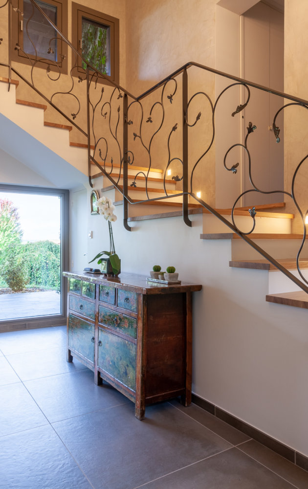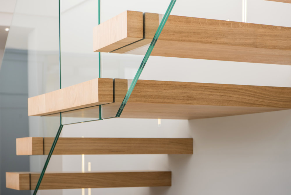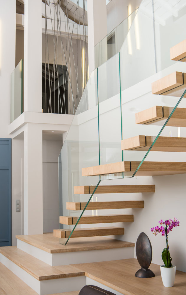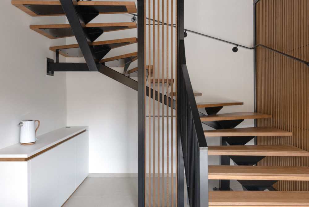 Plus contemporain, et plus léger visuellement, il est souvent composé de marches (sans contre-marches) en bois massif sur limon central en bois ou en acier, tel une colonne vertébrale. Les gardes-corps sont bien souvent réalisés avec des poteaux, tubes et câbles inox ou quelques fois le garde-corps est en verre. On aime le mélange du bois avec l’inox et le verre.
