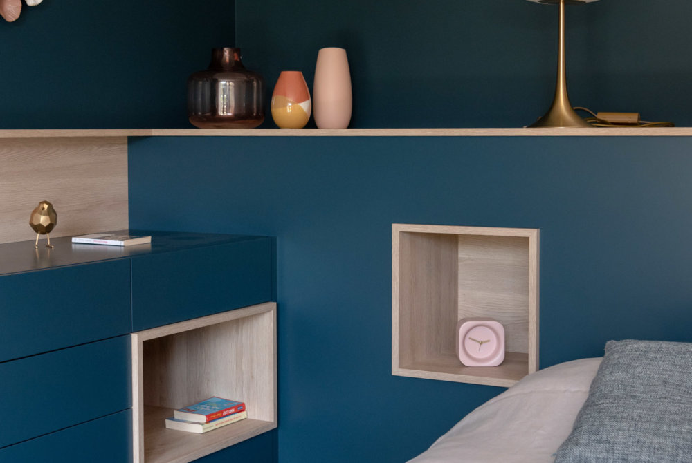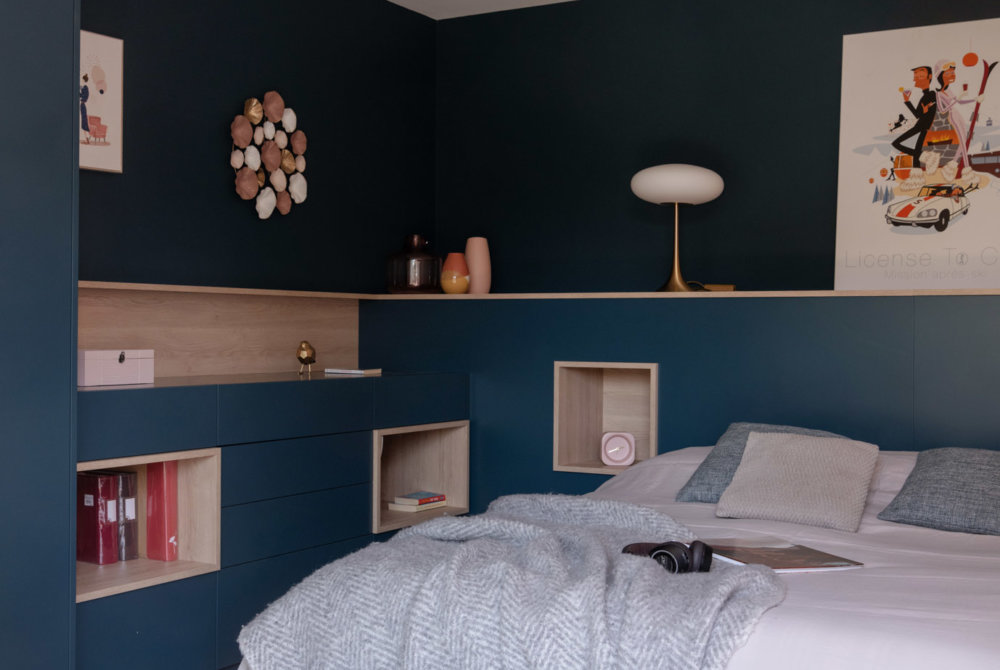 Côté lit, des niches, des tiroirs et une grande tête de lit composent l’aménagement pour offrir de nombreux rangements et renforcer l’aspect chaleureux du lieu par une volumétrie enveloppante permettant de décorer toute la pièce en douceur. La pièce intégralement immergé de bleu canard devient le soir plus nuit que la nuit.