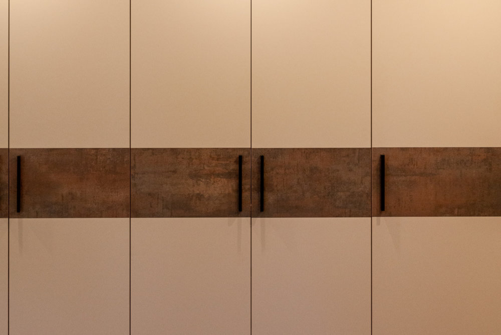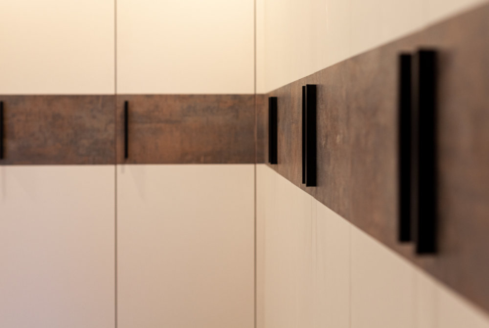 Avec plus de six mètres linéaires de placards muraux comprenant plusieurs espaces penderie, cette chambre offre davantage de rangements que bien des dressings. Et grâce à la bande en bronze cuivrée et aux poignées métalliques noires, aussi discrètes que design, on oublierait presque qu’il s’agit de placards ! Ils habillent la pièce avec un raffinement minimaliste, le cuivre contrastant parfaitement avec le gris cachemire et le parquet.