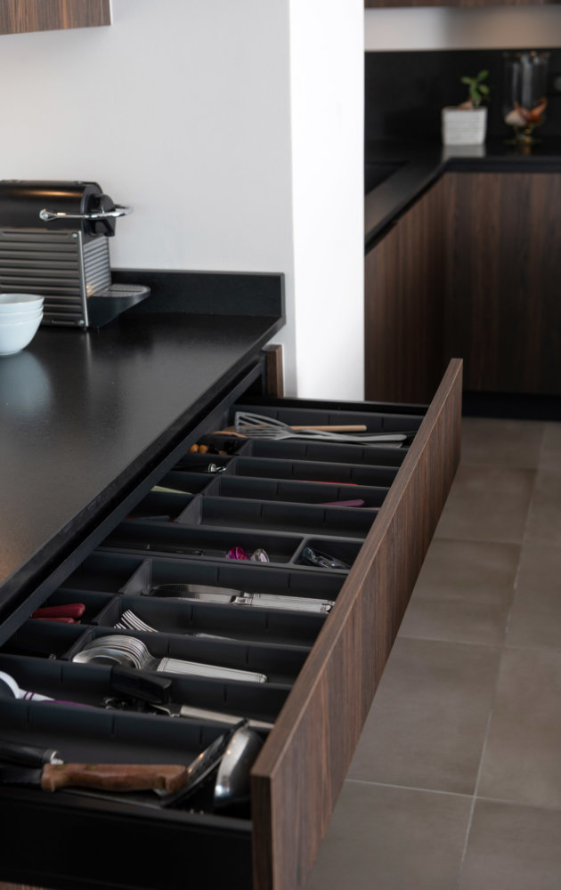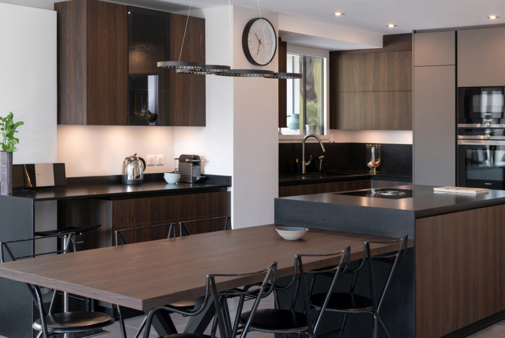 Contemporaine à l’inspiration loft new-yorkais, cette cuisine de caractère se distingue par de nombreux détails venant souligner la sobriété des lignes, à l’image des gorges horizontales et verticales noir mat qui dessinent les tiroirs et les portes, mais aussi du placage bois avec suivi de fil créant ainsi un lien entre les façades d’un même meuble.