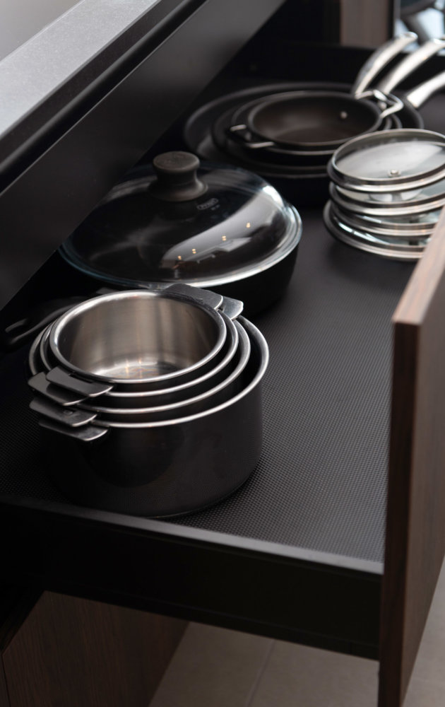 Pour créer le lien avec la bibliothèque du salon, rien de plus naturel que le chêne fumé et le Fenix Bronzo Doha, déjà présents dans le séjour. L’association des deux est ici sublimée par le plan de travail en granit noir Zimbabwe finition cuir. Posé par l’entreprise Carrara, ce dernier offre une belle surface pour se lancer dans des préparations culinaires complexes de jour comme de nuit grâce aux spots intégrés sous les meubles hauts.