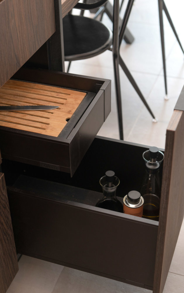 La cuisine regorge de rangements astucieux comme ce tiroir à pin avec sa planche intégrée en chêne massif qui vient combler l’espace au-dessus des bouteilles. La prise électrique discrètement dissimulée sous la table permet de brancher facilement un appareil sur la table.