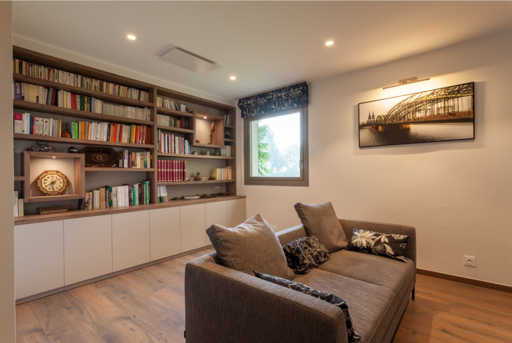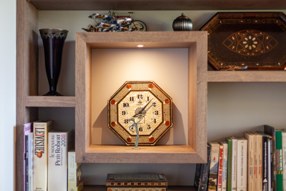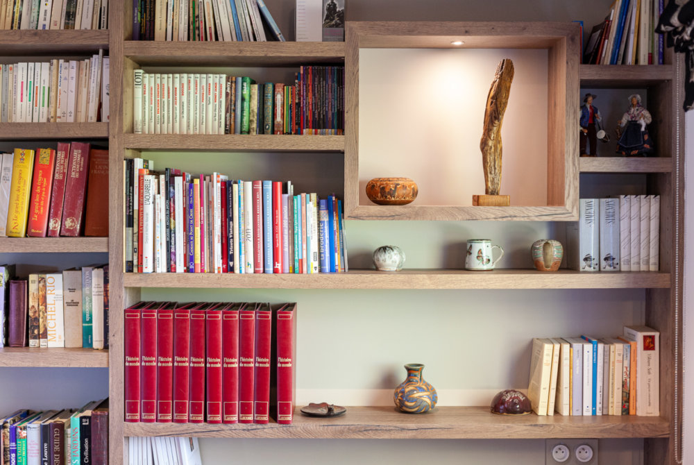 Dans le petit-salon, pièce ouverte et cosy, un espace bibliothèque habille le mur du fond. Il a été conçu dans le même esprit « musée ». Il comprend deux larges niches avec un éclairage L.E.D. qui met en lumière de très beaux objets de décoration et notamment une statuette en bois brut. L’asymétrie des niches casse la linéarité et l’aspect monolithique inhérente à toute bibliothèque. Elle lui donne aussi sa singularité et son aspect contemporain. On retrouve également des solutions de rangements dans le bas de ce meuble, fabriqué en mélaminé chêne teinté.