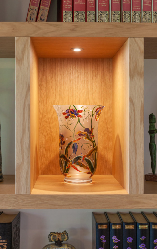 C’est l’architecte d’intérieur Jérôme Pin, responsable du bureau d’étude d’ABEMA, qui a créé cette bibliothèque design. Pour y parvenir, il a emprunté aux codes de la muséographie ses qualités en matière d’ameublement. On retrouve l’éclairage L.E.D. et le système de niches avec panneaux muraux en fond, qui permettent de distinguer les objets mis en valeur du reste de la bibliothèque. Le résultat est saisissant : les objets éclairés n’apparaissent pas comme de simples bibelots disposés sur une étagère, ils donnent leur âme à ce meuble et en dessinent l’ossature. Cette mise en lumière est renforcée par la disposition des niches en quinconce et l’alternance des ouvertures latérales qui dessinent un chemin. Un chemin qui, astucieusement, nous conduit d’un vase à une amphore, d’une assiette à une lampe. C’est ce qui donne à cette élégante bibliothèque en chêne verni naturel son caractère unique, son style contemporain et son originalité.