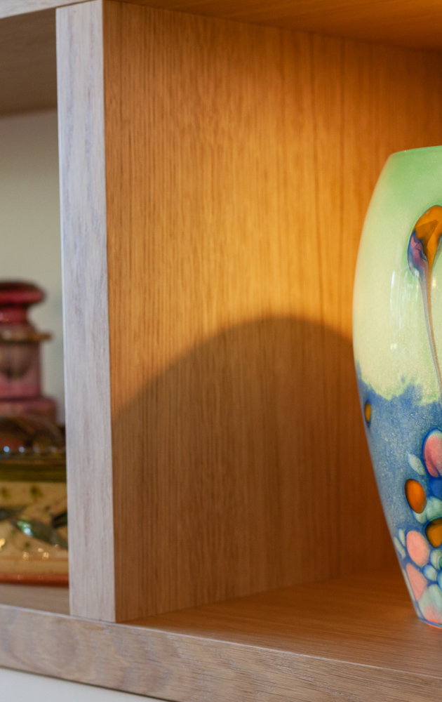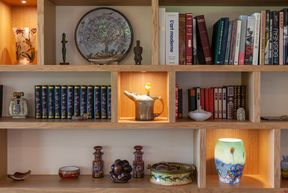 Le salon de cette belle propriété, dans l’Ain, n’est pas seulement ouvert sur l’extérieur… À l’image de son propriétaire, il l’est aussi sur l’art en général, la poterie et la céramique en particulier. Aussi le client a émis le souhait de pouvoir exposer certaines pièces de ses collections dans ce meuble bibliothèque. Elles ont été définies en amont du projet et les hauteurs des étagères ont donc pu être ajustées en fonction de leurs dimensions.