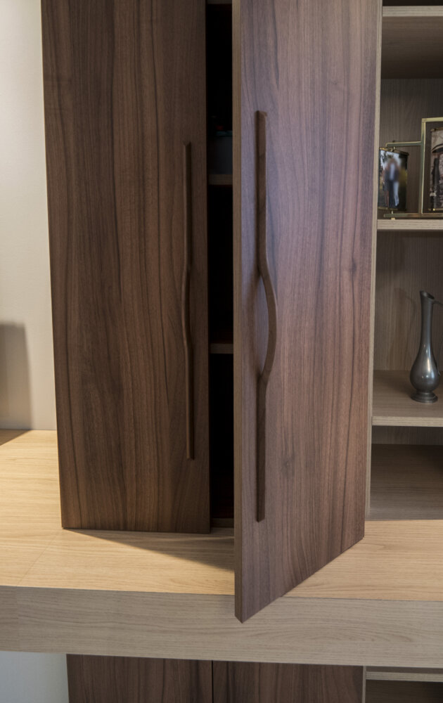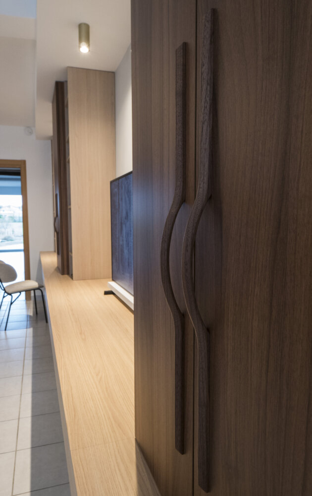 Pour habiller les portes des colonnes noyer et casser la rigidité des meubles, notre choix s’est porté sur les poignées en noyer massif « Beth » de La Quincaillerie. La ressemblance entre l’imitation noyer de Bourgogne naturel des façades et le vrai noyer des poignées est parfaite.