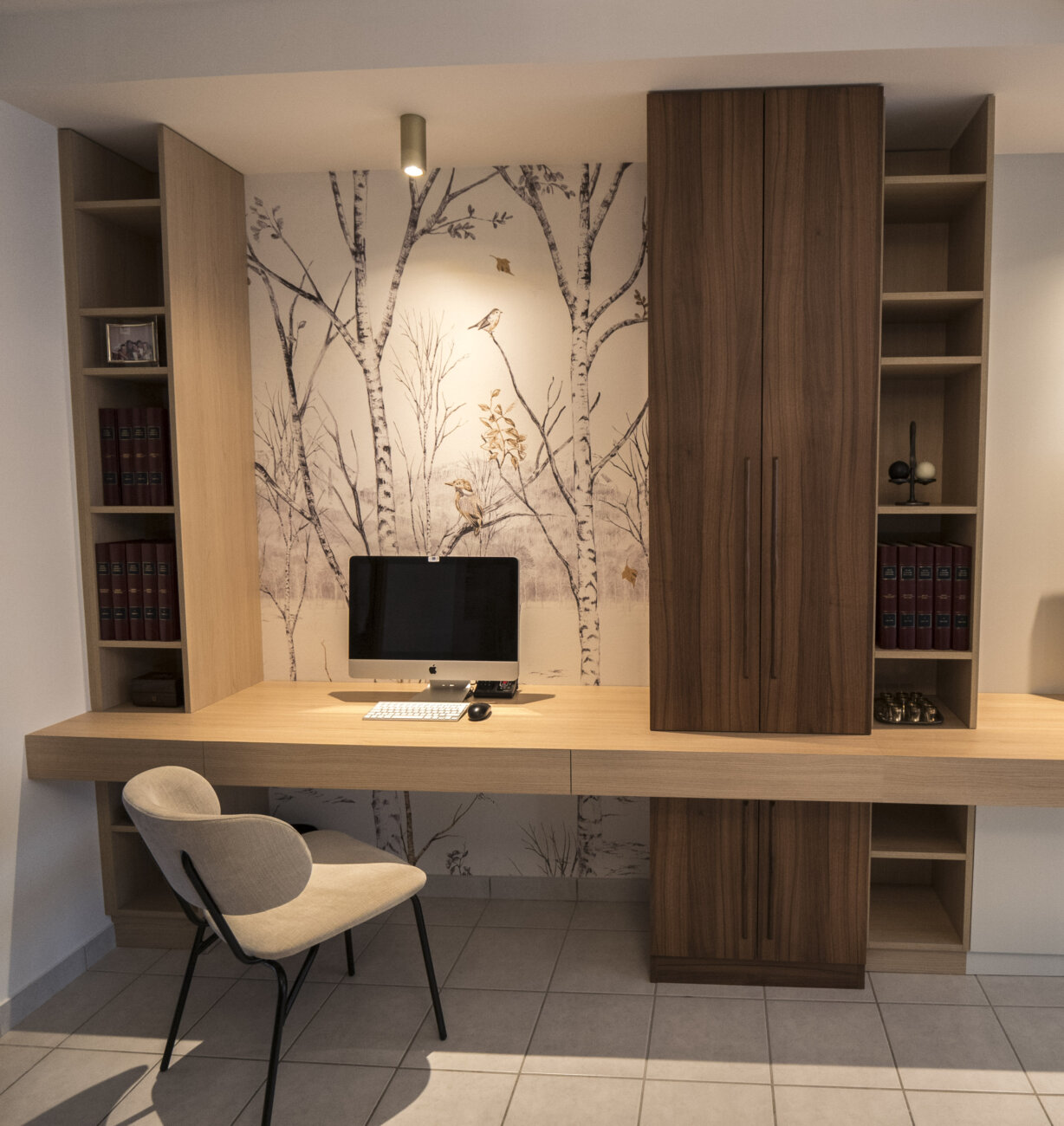 Dans ce projet, le chêne Vicenza de la gamme Egger léger et doux s’intègre parfaitement avec le noyer de Bourgogne naturel également de chez Egger, plus marqué visuellement. La tapisserie au motif de forêt donne au volume un côté onirique.