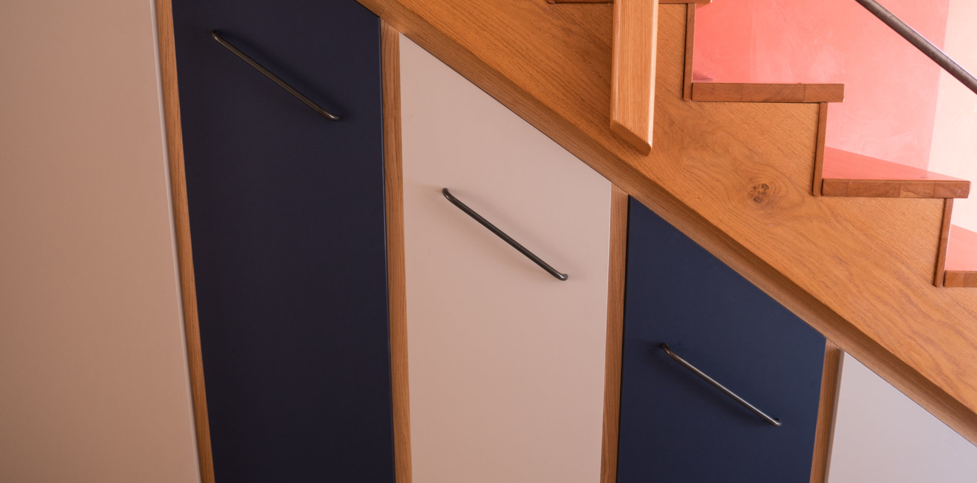 En concevant des rangements sur mesure qui épousent la pente de l’escalier et coulissent discrètement !