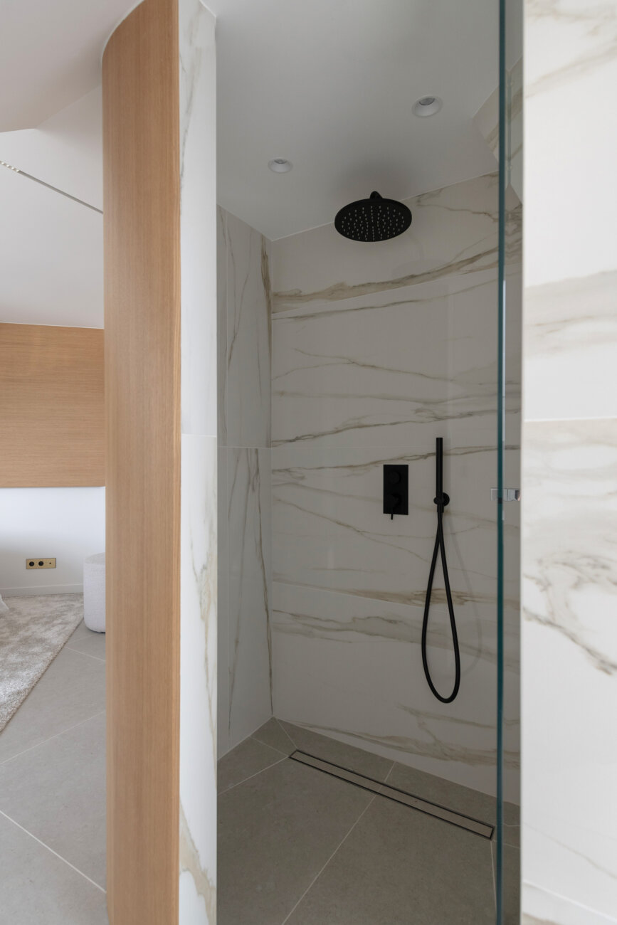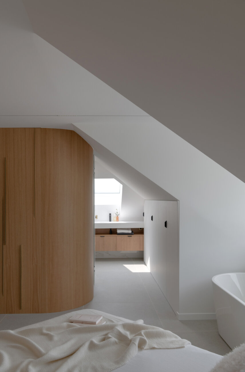 L’espace, pensé comme un cocon, rassemble chambre, salle de bain et dressing dans une continuité fluide. Le défi majeur ? Travailler dans des volumes contraints par la toiture en pente, tout en intégrant des lignes pures et du mobilier intégré.