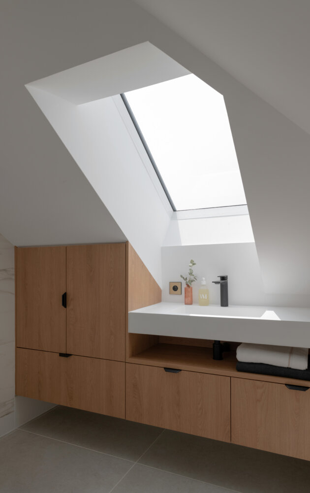 Un meuble vasque suspendu, conçu pour s’adapter à la pente du toit, vient compléter cet aménagement. Là encore, les contraintes techniques ont été transformées en opportunités créatives grâce à une fabrication rigoureuse et une parfaite coordination avec les architectes.