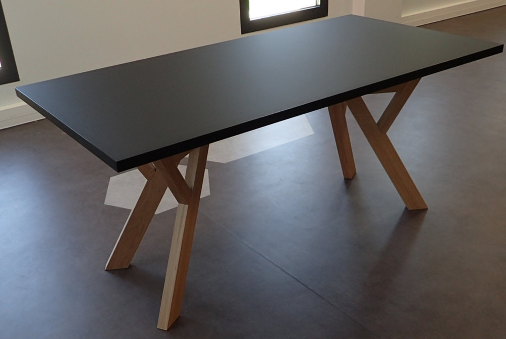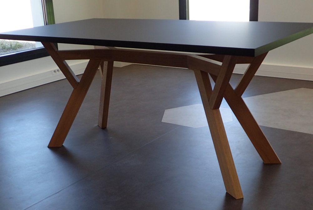 ABEMA a dessiné et fabriqué ces deux tables de réunion destinées à meubler des locaux professionnels à Lyon. Un soin tout particulier a été apporté au piétement en chêne massif : Le design géométrique très moderne met en valeur le contraste entre le plateau et le bois.
