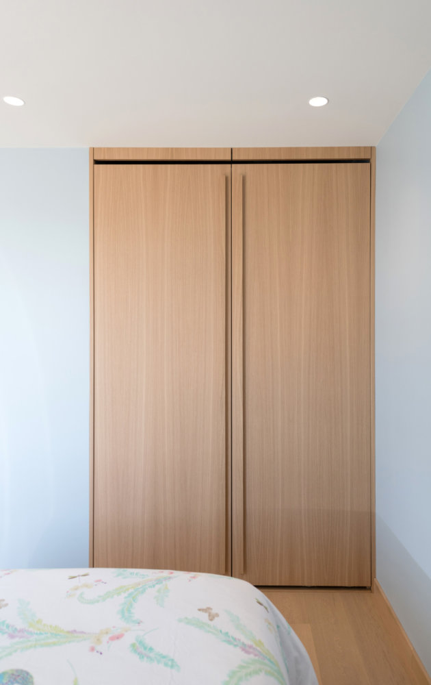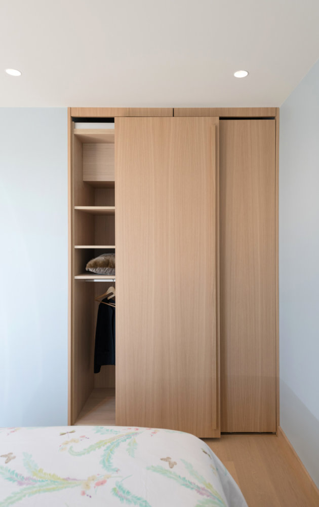 Les placards offrent de nombreux rayonnages et une penderie intégrée. Le choix du chêne comme matériau assure une continuité esthétique. Pour les poignées des portes, c’est une fois encore la patte italienne du fabricant Reguitti qui brille par son élégance.