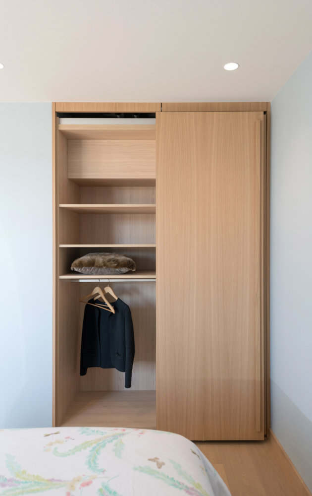 Dans toutes les chambres, la technologie du système coplanaire Slider M35 de chez Salice a été utilisé pour les portes coulissantes. Le résultat est saisissant : les portes affleurent l’une à l’autre, elles ne se superposent pas sur deux axes différents mais sont escamotables l’une sur l’autre, et l’unique rail est invisible.