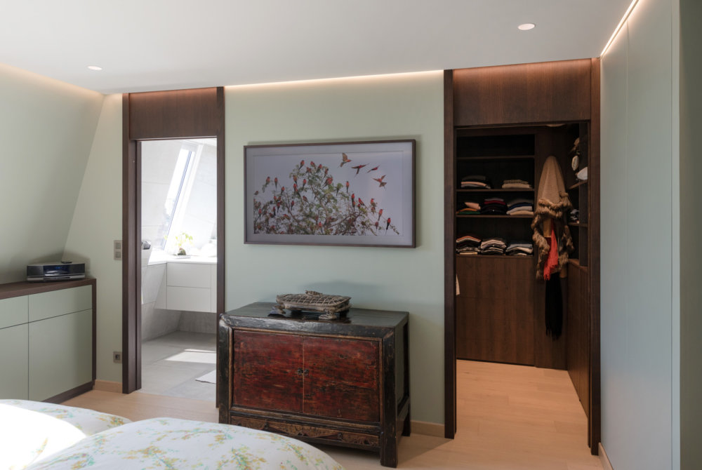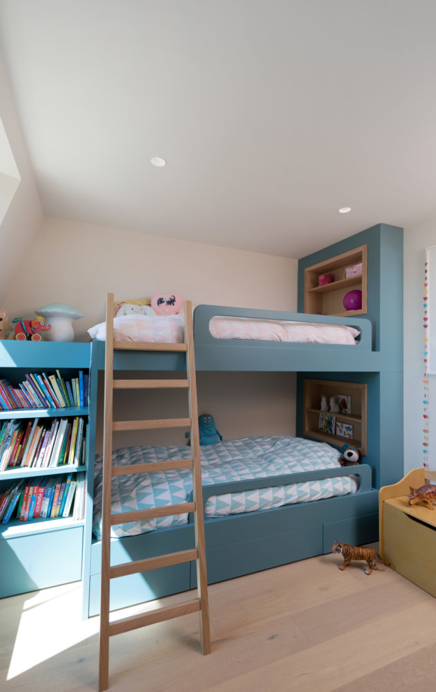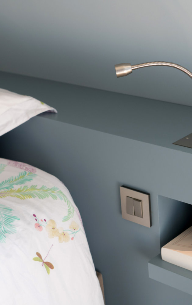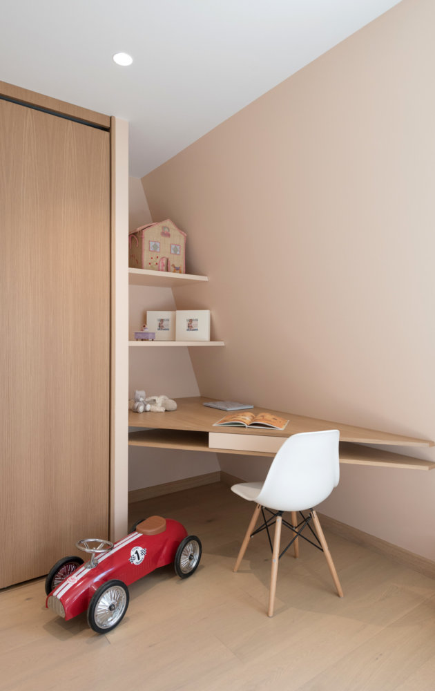 Dans les chambres sous-pentes, c’est l’optimisation des espaces de rangements et l’ajustement aux pans coupés des murs qui a été au cœur de l’agencement.