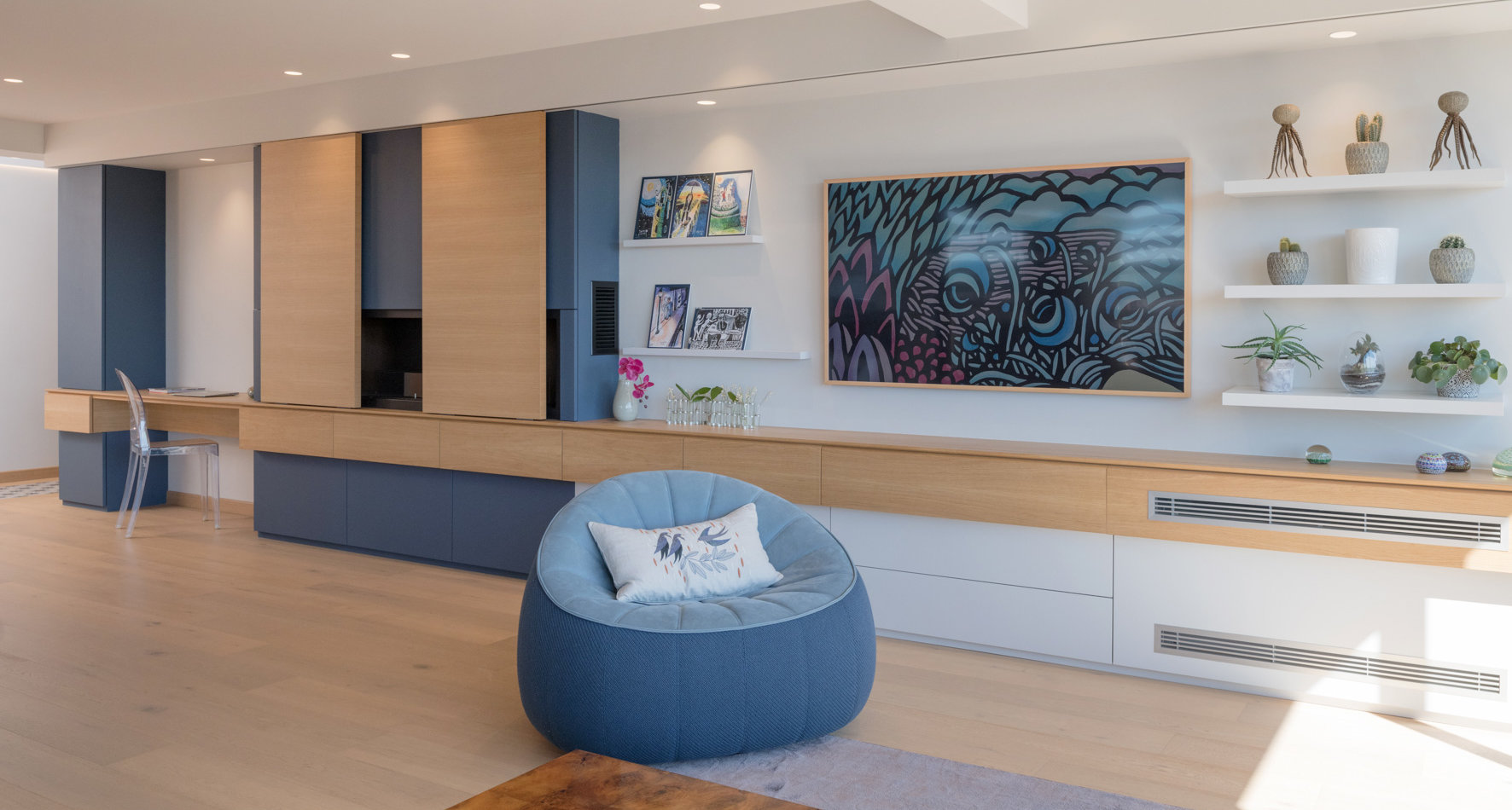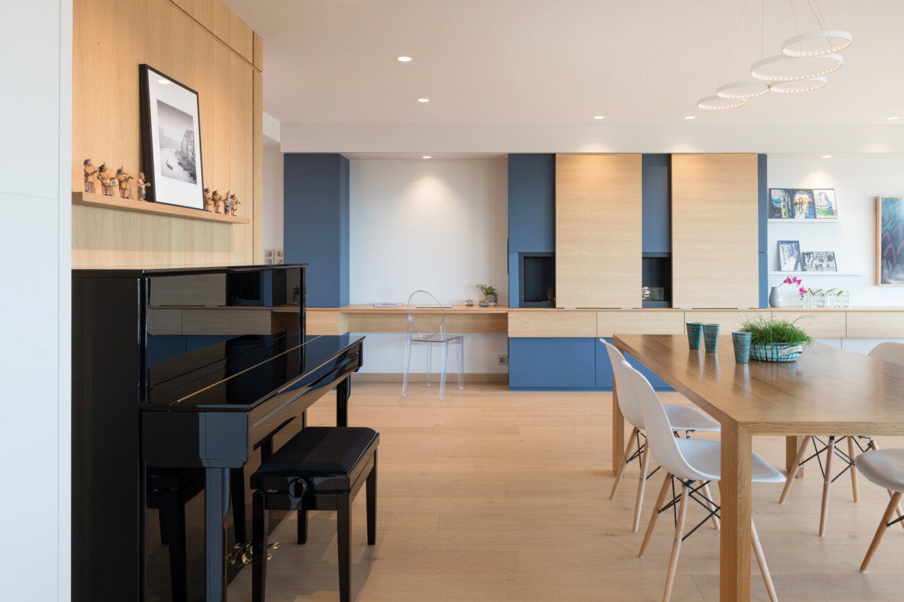 Dans le salon, une attention particulière a été accordée au meuble épuré de plus de huit mètres de long qui s’étend sur toute la longueur de la pièce.