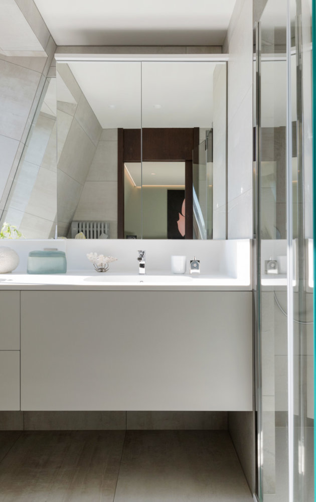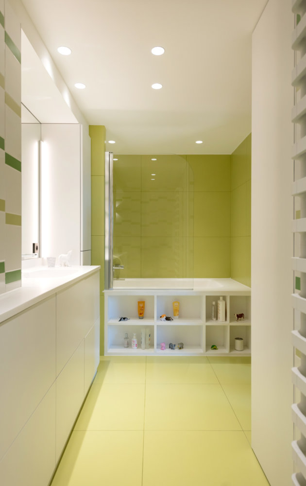 Martine Zoccolo, architecte d’intérieur ( architecture Apparences), a conçu un agencement qui répond à ces attentes, sans jamais sacrifier aux exigences de fonctionnalités et de rangements que la vie quotidienne impose. Le choix des matériaux, des couleurs, des technologies illustre le souci permanent du détail qui a conduit à la conception de ce foyer. Le système coplanaire pour les panneaux coulissants du meuble du salon et pour les portes des placards des chambres en est le meilleur exemple.