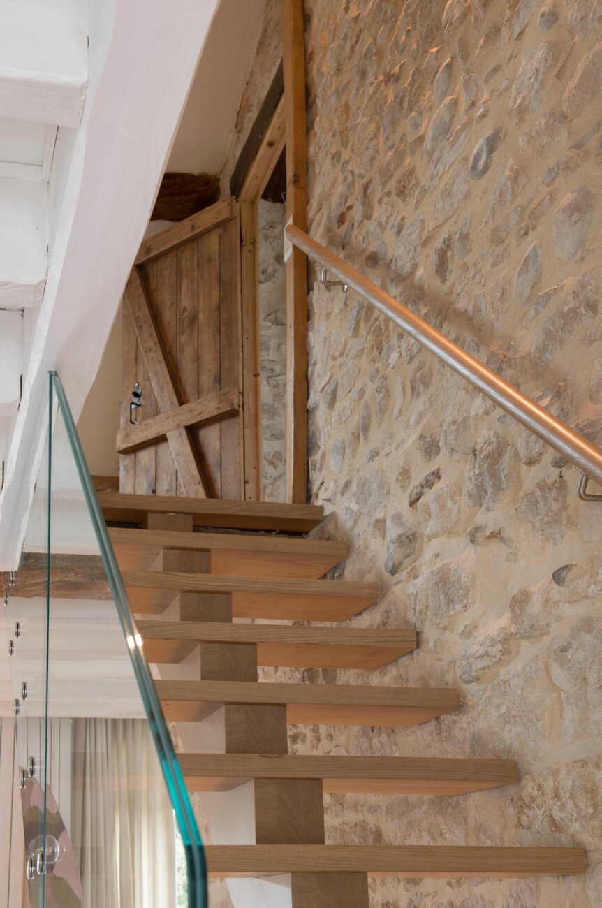 Pour relier les deux niveaux et mettre en valeur la pierre apparente, l’escalier devait être sobre et lisible. Une exigence qui nous a conduit à concevoir une structure sans contremarche composée d’un limon central en chêne, d’un garde-corps en verre et d’une main courante fixée directement dans le mur.