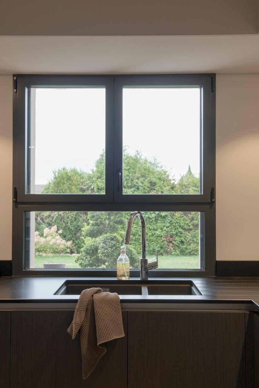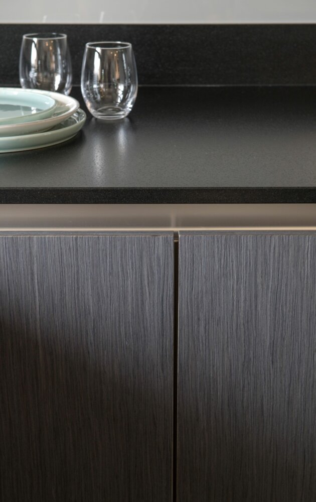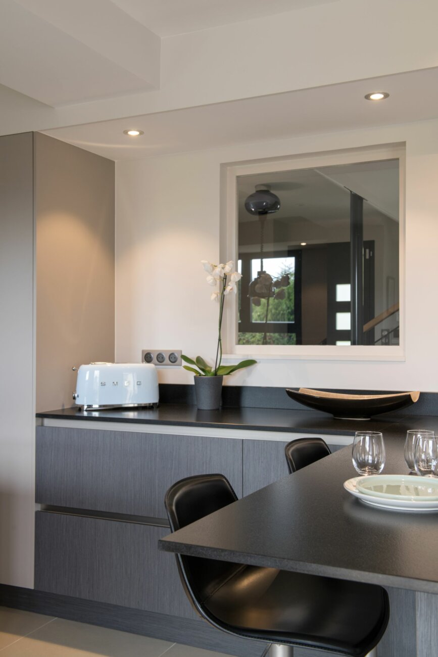 Enfin, ce qui se dévoile après quelques minutes d’attention, c’est le placage des façades en chêne Titane de chez Hubler qui affiche un veinage apparent délicat et graphique. Cette cuisine au charme intemporel et au look contemporain offre une palette chromatique subtile : on passe ainsi d’un beige Arizona pour les colonnes à un granit noir Zimbabwe qui habille le plan de travail, puis d’un verre laqué (dans la même teinte que les colonnes) pour la crédence – à des poignées effet inox brossé.